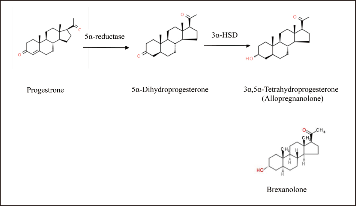 產後憂鬱症的病理生理學機制目前還不是非常清楚,推測導致疾病機轉可能來自於複雜的體內賀爾蒙改變所導致,而體內賀爾蒙改變可由「下視丘-腦下垂體-腎上腺」軸線的生理機制來做說明,當下視丘感受到壓力時,則可能會分泌促腎上腺皮質激素(adrenocorticotropic hormone,ACTH),進一步會刺激腎上腺釋出皮質醇(cortisol),這類壓力性賀爾蒙可來面對壓力,在生產後則可能會減少皮質醇的釋出,皮質醇的缺乏則可能會使人缺乏活力、慢性疲勞及煩躁健忘等4;懷孕時,體內黃體激素大量增加,以維持胎兒於子宮生長的穩定性,而生產後體內黃體素(progestrone)可能會突然減少。目前推測這個賀爾蒙的減少與產後憂鬱症具有極大的相關性;在體內黃體素的代謝途徑如圖一顯示,別孕烷醇酮(allopregnanolone)為黃體素的代謝物,這類的類固醇類性賀爾蒙可在性腺及腎上腺上發現,而別孕烷醇酮會影響心情以及讓我們適應壓力,當投予黃體素以及其代謝物,如:別孕烷醇酮等,這些賀爾蒙會作用在GABAA接受器,因此有解焦慮、鎮靜以及抗癲癇作用。因為在懷孕的過程中別孕烯醇酮的血中濃度會持續的增加,而在生產後則會迅速下降,此項假設也由Nappi等人5的研究證實,在產後憂鬱症婦女其血清的別孕烷醇酮確實有明顯偏低,因此,別孕烷醇酮也被認為是與誘發產後憂鬱症具有關聯性6。