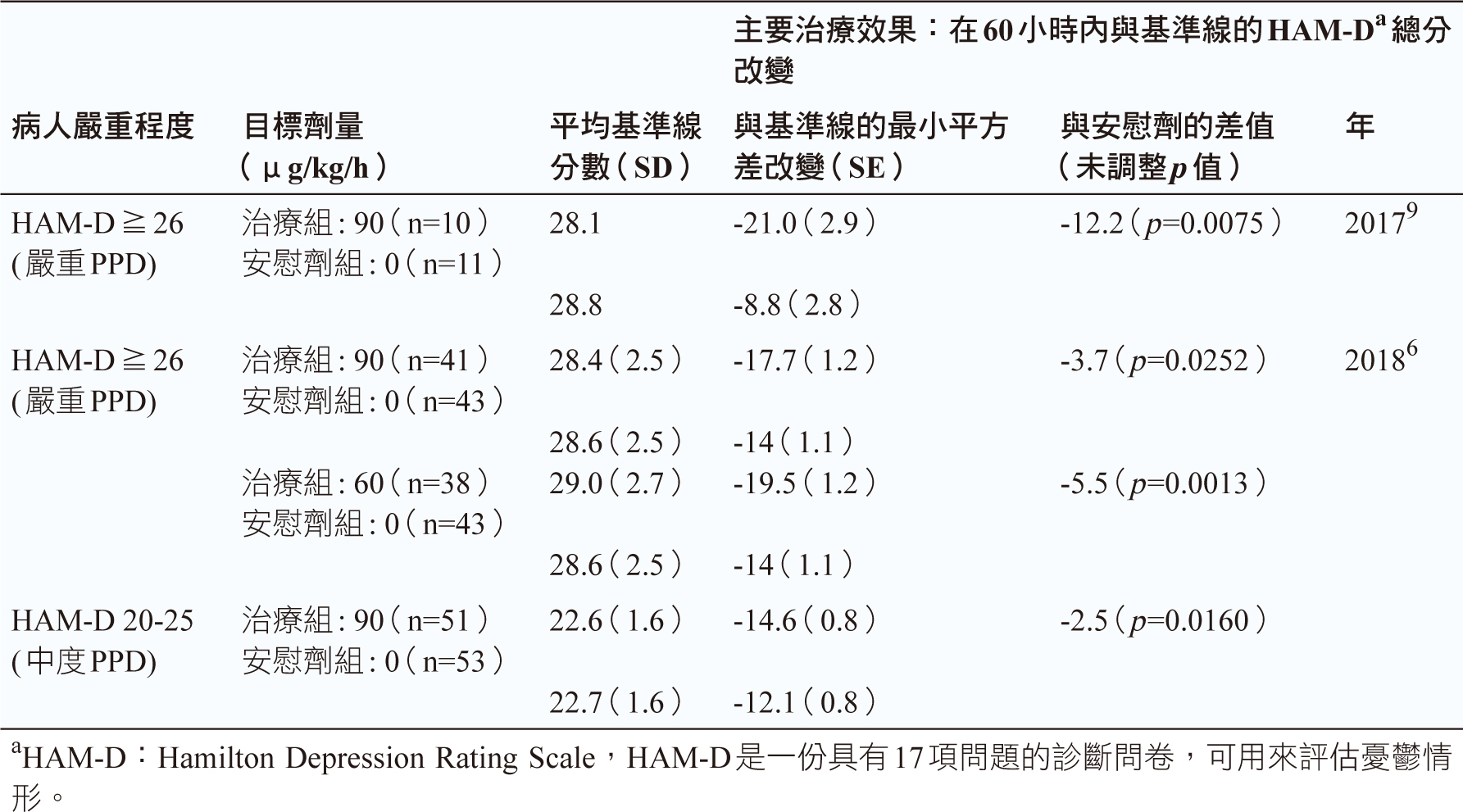 在評估Brexanolone的治療產後憂鬱症的療效是以漢式憂鬱症量表(Hamilton Depression Rating Scale,HAM-D)的分數為評估指標,漢式憂鬱症量表是一份具有17項問題的量表,量表中考量憂鬱情緒、罪惡感、自殺意念、失眠情形、工作狀態、活力及體重改變等因素8。HAM-D分數落於0至52分之間。HAM-D分數越高,代表可能會具有越嚴重的憂鬱情緒。診斷為「嚴重」的產後憂鬱症,HAM-D分數為≧26分;而診斷為「中度」的產後憂鬱症,HAM-D分數則落於20至25分間。表一比較brexanolone兩篇重要的臨床試驗之療效,兩篇研究分別收納不同疾病嚴重程度的受試者並使用不同劑量來比較其效果,研究討論結果如下。