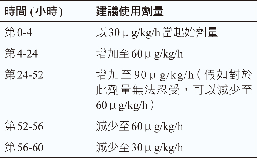 Brexanolone所建議的使用劑量表如表二。Brexanolone以一種濃縮小玻璃瓶供給使用,可以用生理食鹽水稀釋為含有100 mL及濃度為1mg/mL的五袋藥劑。這些藥劑在投予前調劑即可,稀釋後藥品可冷藏96小時或在室溫下放置12小時。假如於投藥期間發生過多的鎮靜反應,可以先停止輸注或是以較低劑量給予,要持續監控病人的含氧量,如果出現缺氧情形則必須要停止給藥。如果無法忍受90μg/kg/h也可以降低為60μg/kg/h。